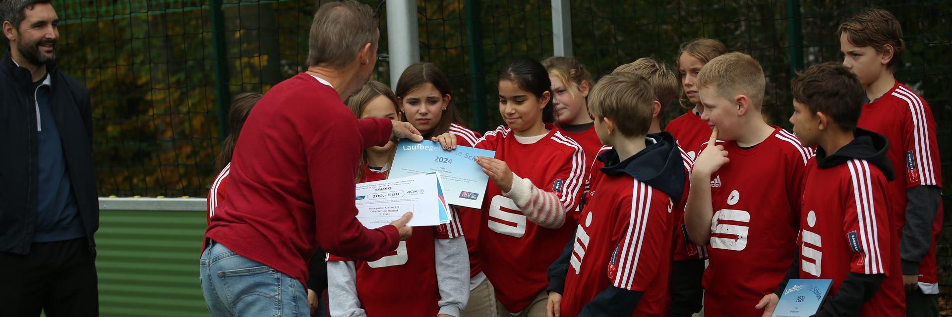 Gold und Silber für die OBS Hattorf: Rainer Behrens würdigte die Schülerinnen und Schüler der Oberschule für ihre tollen Leistungen beim AOK-Laufabzeichenwettbewerb.