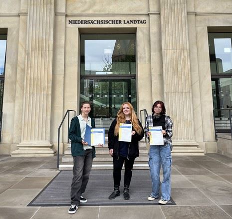 Schließlich gewannen gleich zwei der vier entstanden Projekte einen Förderpreis, jeweils im Wert von 200 Euro, beim diesjährigen Geschichtswettbewerb. Die Gewinnerinnen wurden am 27.September 2023 ins Forum des niedersächsischen Landtages eingeladen und durch die Kultusministerin Julia Willie Hamburg, der Landestagspräsidentin Hanna Naber und dem Vorstandssitzenden der Körber-Stiftung Lother Dittmar gewürdigt.